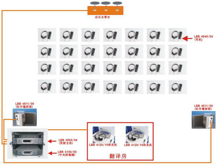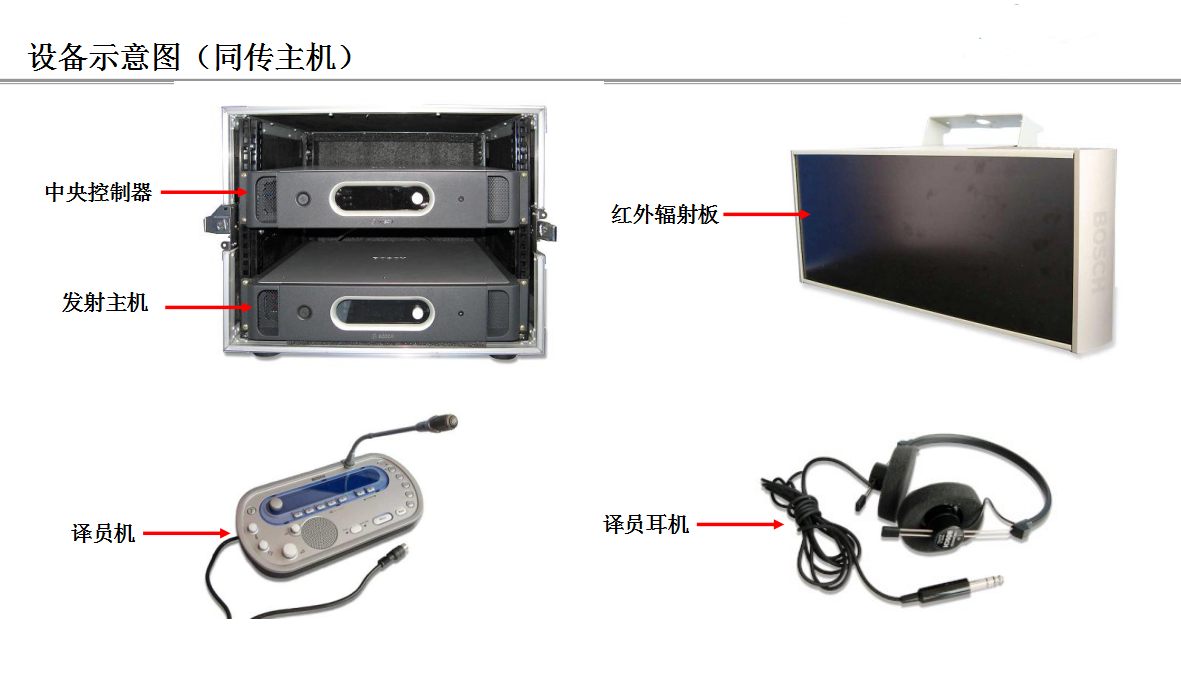 一套完整的同傳設(shè)備包括同傳主機(jī)、紅外發(fā)射主機(jī)、紅外發(fā)熱板、翻譯器、翻譯間、同傳耳機(jī)(代表接收單元)等組成。翻譯器和翻譯間的個(gè)數(shù)將根據(jù)會(huì)議語(yǔ)言數(shù)來(lái)定。同傳耳機(jī)(代表接收單元)根據(jù)參會(huì)人數(shù)來(lái)定。
